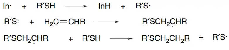 A adição de compostos de S-H a alcenos por um mecanismo em cadeia de radicais é uma reação bastante geral e eficiente. O mecanismo é análogo à adição de brometo de hidrogênio. A energética, tanto da abstração de hidrogênio, quanto para as etapas de adição, são favoráveis. A reação apresenta regiosseletividade anti-Markovnikov.[1]