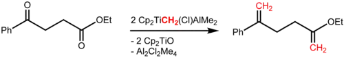 Cp2Ti(CH3)2 + Al(CH3)2Cl → Cp2TiCH2AlCl(CH3)2 + CH4
