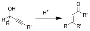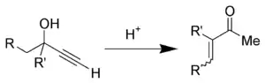 A reação de álcoois terciários (frequentemente promovida por ácido fórmico) contendo grupos acetilênicos não produz os aldeídos esperados, mas preferencialmente metil cetonas α,β-insaturadas via um intermediário enina.[5]