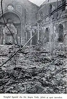 - O Holocausto - um aviso da história, incluindo fotos das vítimas e de uma sinagoga que foi incendiada (romeno)