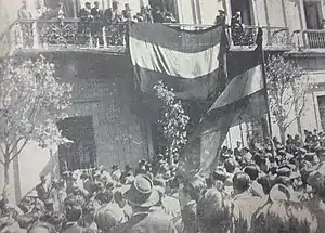 ![]() Manifestantes penduram uma Bandeira da Bolívia do lado de fora de um prédio do governo | |||||||||||