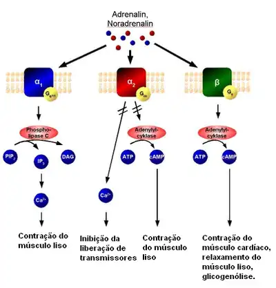 Outros efeitos incluem a glicogenólise e a gliconeogênese a partir do tecido adiposo e da reserva de glicogênio do fígado, bem como a secreção de glândulas sudoríparas e a reabsorção de Na+ nos rins.[6] Alguns antagonistas são usados na hipertensão.