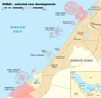 Nos últimos anos o emirado de Dubai, tem desenvolvido diversos projetos para ganhar terras ao mar, e construir Ilhas artificiais mostradas no mapa em cor rosa.
