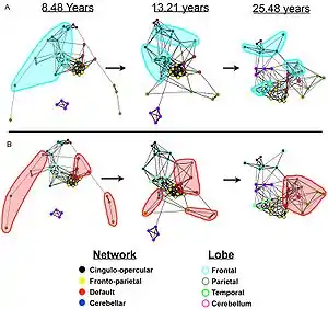 No cérebro infantil, há evidências limitadas da rede padrão, mas a conectividade de rede padrão é mais consistente em crianças de 9 a 12 anos, sugerindo que a rede padrão passa por mudanças no desenvolvimento.[8]