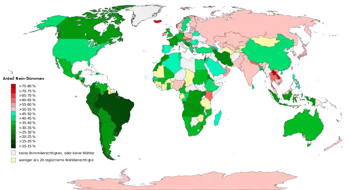 | As províncias em verde tiveram maioria de votos pelo "Sim", enquanto que as províncias em vermelho votaram em sua maioria pelo "Não". | |||||||||||