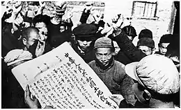 No entanto, a partir de 1953, o Partido Comunista Chinês (PCCh) lançou a "campanha de transformação socialista" e começou a implementar a propriedade coletiva das terras desapropriadas por meio da criação de "cooperativas de produção agrícola".[10][11] Os direitos de propriedade da terra foram retirados dos camponeses novamente e transferidos para "propriedade do Estado".[12] Um exemplo notável é a "comuna popular".[13]