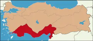 - A maior parte do texto foi inicialmente baseada artigo «Mediterranean Region, Turkey» na Wikipédia em inglês (acessado nesta versão).
