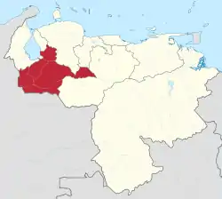 A região andina na Venezuela (em vermelho), a oeste do mapa.