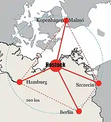 - Rostock é o centro urbano mais importante entre as áreas metropolitanas de Hamburgo a oeste, a de Szczecin (Polônia) a leste, Copenhague-Malmö (Região Transnacional de Oresund, Dinamarca/Suécia) a norte e Berlim ao sul;