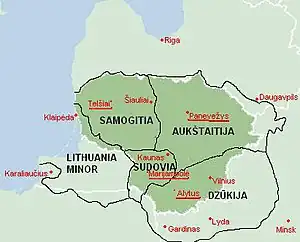 A Lituânia pode ser subdividida em regiões (em lituano: regionai)[1] do ponto de vista histórico ou etnográfico, cujos limites são imprecisos, uma vez que não constituem unidades políticas ou administrativas oficiais. A delimitação é cultural: tradições e estilos de vida locais, músicas, histórias, etc. Em certa medida, as regiões sobrepõem-se às áreas em que os diferentes dialetos lituanos são falados, embora essa correspondência não seja rigorosa; por exemplo, embora o dialeto dzūkian também seja chamado aukštaitian do sul, isso não significa que a região da Dzūkija faça parte da Alta Lituânia (em lituano, Aukštaitija). Em certas partes de algumas regiões, os dialetos de outras regiões são falados, enquanto na Samogícia existem três dialetos nativos, o samogiciano do sul, norte e oeste, alguns ainda mais divididos em sub-dialetos.