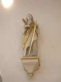 | Atribuições | retratada experimentando os tormentos do martírio, ou recebendo consolo espiritual na prisão por uma visão de uma pomba em uma cruz luminosa. |