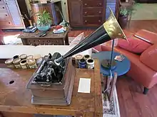 O fonógrafo foi inventado em 1877 por Thomas Edison. Foi o primeiro aparelho capaz de gravar e reproduzir sons através de um cilindro de couro coberto por uma folha de estanho montado sobre o eixo horizontal da máquina. Ela possuia uma manivela que posteriormente seria trocado por uma bateria e era acionado por uma agulha ligada a um diafragma capaz de riscar a superfície do estanho conforme a vibração provocada pelas ondas sonoras.[7]