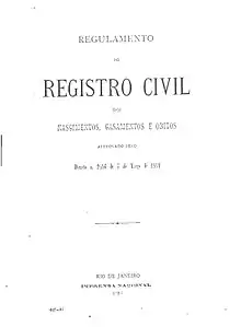 - Império do Brasil. «Decreto nº 5.604, de 25 de março de 1874 (Manda observar o Regulamento desta data para execução do art. 2° da Lei n° 1829 de 9 de Setembro de 1870, na parte em que estabelece o registro civil dos nascimentos, casamentos e obitos.)». 1874-04-25. Consultado em 24 de janeiro de 2020