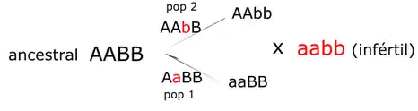 Theodosius Dobzhansky e Hermann Joseph Muller desenvolveram estudos genéticos a fim de explicar como os mecanismos de isolamento pré-zigóticos e pós-zigóticos são influenciados pela seleção natural e mutações de alelos exclusivos através da especiação resultante da incompatibilidade genética intra-espécie.[2] É a base de todo o trabalho moderno sobre a genética da esterilidade dos híbridos e inviabilidade pós-cópula, com fundamentos dos estudos de Haldane. Tal influência acontece porque o processo de especiação é muito variado pela decorrência de isolamentos reprodutivos que possam vir a ocorrer por barreiras, seja por distanciamento ou isolamentos gaméticos como a infertilidade, entre indivíduos mais novos de partes das populações dessa espécie. Logo, a frequência alélica se dispõe geneticamente diferente de forma que o modelo concentra sua teoria diante da idealização da existência de uma nova linhagem caso haja apenas um indivíduo com essa mutação, considerando que, as duas espécies agora com seus alelos fixos, são incompatíveis entre si. Além disso, o modelo também explica a alteração cromossômica na evolução. Então, Se duas populações idênticas, porém isoladas, começam com um genótipo AABB, mas o primeiro grupo evolui para aaBB e o segundo para AAbb, e se encontrarem no cruzamento para formar um híbrido, a combinação de a e b ou A e B surge pela primeira vez na realidade daquela população recente, tornando essa prole hibridizada inviável com seus ancestrais (confira a imagem ao lado para melhor compreensão).