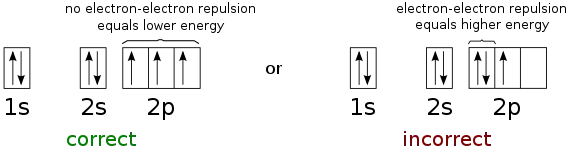 Dois elétrons não podem compartilhar o mesmo conjunto de números quânticos dentro do mesmo sistema; portanto, há espaço para apenas dois elétrons em cada orbital espacial. Um desses elétrons deve ter ms = ½ e o outro deve ter ms = -½.[4]