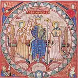 - A Chronica Adefonsi Imperatoris, escrita entre 1153 e 1157, reflete as mudanças políticas no território. No ano de 1139, quando o imperador Afonso VII inicia a campanha militar contra o castelo de Oreja, reúne a "milícias de toda a Galiza, da terra de Leão e de Castela".[125] No Poema de Almería (ca. 1147), épico anexo à crónica, é sublinhada a primazia do território galego sobre os demais domínios imperiais ao descrever a ordem de marcha dos exércitos.[126][127] Os galegos lideram a expedição seguida pela cavalaria da cidade de León, a "urbis legionis".[128]