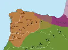 Essa distinção também aparece em concílios visigodos (em 589 são estabelecidas orações para as igrejas da Espanha, Gália e Galícia,[19] e em 683 um decreto fiscal diferença entre os mesmo espaços territoriais para a sua aplicação),[20] e na crónica de João Biclarense († 621), que diferencia a "provincia Gallaecia" da "provincia Gothorum"[21] e concorda em apontar os bispos da Espanha, Gália e da Galiza.[22]