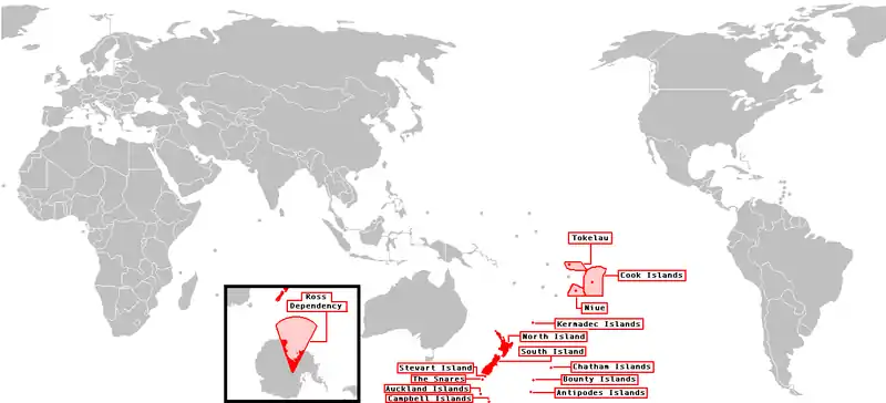 - a Dependência de Ross, que faz parte da Antártida. É constitucionalmente parte da Nova Zelândia.[3] No entanto, a aplicação de soberania dentro da dependência é subsequente após a aplicação dos termos encontrados no Tratado da Antártida.