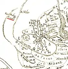 | “ | a leste, incluía o país gumuz entre Galabate e o Nilo Azul, com seu centro em Guba; a oeste, incluía o país burum, com seu centro em Jebel Gule, cujo reino se estendia até o sul de Cafa, no sul da Etiópia, e para o sul incluía principalmente o país berta, ao longo do vale aurífero de Tumate até Fadasi nos arredores do território habitado pelos oromos.[22] | ” |