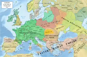 Como o único sobrevivente dos antigos reinos, o Reino Franco forneceu o modelo da realeza medieval que mais tarde inspiraria monarcas medievais durante o resto do período medieval.[15] Embora os governantes francos se lembrassem dos ideais romanos e muitas vezes aspirassem a ideias vagas de restauração imperial, os séculos de seu governo transformaram o governo de seu reino em algo que lembrava muito pouco o Império Romano. A nova forma de governo era pessoal, baseada em poderes e relacionamentos entre indivíduos, ao invés do sistema fortemente administrado, judicial e burocrático do Império Romano.[35] O tempo dos reinos bárbaros chegou ao fim com a coroação de Carlos Magno, rei dos francos, como imperador romano pelo Papa Leão III em 800,[38] em oposição à autoridade do remanescente Império Romano do Oriente.[39] O Império Carolíngio de Carlos Magno, um predecessor da França e da Alemanha, era na realidade mais semelhante a uma coleção de reinos unidos apenas pela autoridade de Carlos Magno do que um reino com conexão significativa com o antigo Império Romano do Ocidente.[40]