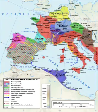 Em 376, os visigodos, fugindo dos ostrogodos, que por sua vez fugiam dos hunos, foram autorizados a cruzar o rio Danúbio e se estabelecer nos Bálcãs pelo governo do Império Romano do Oriente. Os maus-tratos aos refugiados góticos causaram uma rebelião em grande escala e, em 378, eles infligiram uma derrota incapacitante ao exército de campo romano oriental na Batalha de Adrianópolis, na qual o imperador Valente (r. 364–378) também foi morto.[9] A derrota em Adrianópolis foi chocante para os romanos e os forçou a negociar e estabelecer os visigodos dentro das fronteiras do Império, onde se tornariam federados quase independentes sob seu próprio líder.[10] As guerras civis romanas no final do século IV, bem como os períodos de guerra fria entre as cortes imperiais dos impérios romano ocidental e oriental, permitiram que os visigodos sob seu líder Alarico I (r. 395–410) se tornassem uma força ativa na política imperial, apenas tênue ligada ao próprio governo imperial em si mesmo.[8] Com chegada dos visigodos aos Balcãs seguiu-se a migração dos alanos, vândalos e suevos para a Gália entre 405 e 407 na travessia do Reno.[8] Embora os bárbaros no Reno fossem efetivamente mantidos sob controle e administrados pelo usurpador e imperador Constantino III (r. 407–411), o fim de seu reinado devido a mais conflitos internos romanos levou as tribos a penetrar profundamente na Gália. e Hispânia.[11]