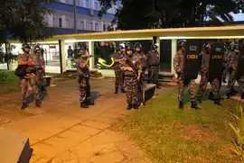 Um dia depois, às 5h10 da manhã de 8 de novembro, uma grande operação policial cercou o Conjunto Residencial da USP e a região da Antiga Reitoria, e retirou os estudantes à força. Cerca de 400 policiais da Tropa de Choque, da polícia montada, do COE, do GATE, além de helicópteros do GRPAe da Polícia Militar de São Paulo cercaram a Reitoria da USP e detiveram 73 pessoas, 63 das quais ocupavam o prédio e 10 por desacato. A Polícia contabilizou 24 mulheres e 49 homens. De acordo com alguns ocupantes entrevistados pelo programa Fantástico, o efetivo utilizado na operação teria sido desproporcional e desnecessário.[carece de fontes] Os alunos detidos foram levados em ônibus da polícia para a 91ª Delegacia de Polícia, onde um por um foram autuados em flagrante e indiciados por desobediência a ordem judicial.[45] Os invasores puderam sair da DP após o pagamento de fiança, paga com dinheiro arrecadado de simpatizantes por sindicatos de diversas categorias do Estado de São Paulo. Mais de dez sindicatos se envolveram na arrecadação, entre eles, a APEOESP (Sindicato dos Professores Estaduais Paulistas), o Sindicato dos Metroviários, o Sindicato dos Bancários, o Sindicato dos Metalúrgicos de São José dos Campos e o Sindicato dos Trabalhadores do Judiciário Federal.[46]