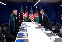 Em 2 de maio de 2012, o presidente afegão, Hamid Karzai, e o presidente dos Estados Unidos, Barack Obama, assinaram um acordo de parceria estratégica entre os dois países depois que o presidente dos Estados Unidos chegou a Cabul como parte de uma viagem sem aviso prévio ao Afeganistão no primeiro aniversário da morte de Osama bin Laden. [12] O Acordo de Parceria Estratégica Estados Unidos-Afeganistão, oficialmente intitulado "Acordo de Parceria Estratégica Duradoura entre a República Islâmica do Afeganistão e os Estados Unidos da América" [13], estabelece a estrutura a longo prazo para a relação entre o Afeganistão e os Estados Unidos após a retirada das forças estadunidenses da guerra no Afeganistão. [14] O Acordo de Parceria Estratégica entrou em vigor em 4 de julho de 2012, como afirmado pela Secretária de Estado dos Estados Unidos Hillary Clinton, que declarou em 8 de julho de 2012 na Conferência de Tóquio sobre o Afeganistão: "Como vários países aqui representados, um Acordo de Parceria Estratégica que entrou em vigor há quatro dias".[15]
