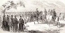 As negociações com Napoleão III, iniciadas através de Shibata Takenaka assim 1865. Em 1867, a primeira Missão Militar francesa para o Japão chegou a Yokohama, entre eles o Capitão Jules Brunet.[28] A missão militar estaria engajada em um programa de treinamento para modernizar os exércitos do Xogunato, até a guerra de Boshin começou um ano depois, levando a uma guerra civil em grande escala entre o Shogunato e o pro-forças Imperiais. No final de 1867, a missão francesa tinha treinado um total de 10.000 homens, voluntários e recrutas, organizado em sete regimentos de infantaria, cavalaria, batalhão, e quatro batalhões de artilharia.[32] é bem conhecido fotografia do Shogun Tokugawa Yoshinobu em uniforme francês, tomadas durante esse período.[33]