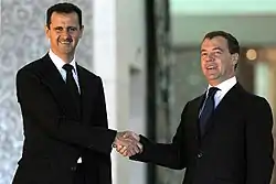 Com uma forte aliança com a Síria, a Rússia vetou junto à China duas resoluções no Conselho de Segurança das Nações Unidas relativas à condenação da repressão realizada pelo regime de Bashar al-Assad. A Rússia, que também tem criticado maiores sanções contra a Síria pelos países do Ocidente e da Liga Árabe, possui relações políticas e estratégicas próximas com o regime de Assad, e têm sido o maior fornecedor de armas do país.[2]