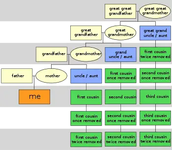 Árvore de Família é o diagrama que mostra a relação de cada pessoa com a pessoa na cor laranja, os primos estão coloridos de verde. Quando referenciamos a alguém como um [primo], serão usadas palavras adicionais para melhor esclarecer a relação exata entre duas pessoas.