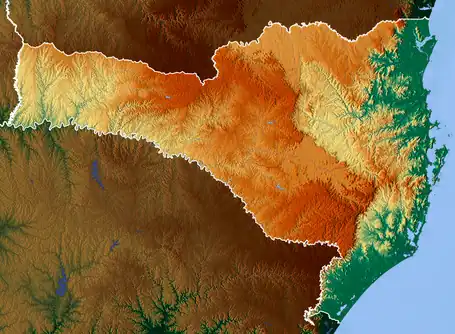 As menores altitudes estão na baixada litorânea, que engloba as terras localizadas aquém de 200 metros. Na parte norte, é bem larga, entrando sertão adentro, por meio dos vales dos rios que correm da serra do Mar. Enquanto isso, em direção ao sul, encurta-se gradativamente. A Serra do Mar ocupa a baixada litorânea na parte oeste. No norte do estado, compõe a borda montanhosa de um planalto razoavelmente médio. Possui traço muito diferente do que abriga em demais estados como Paraná e São Paulo. Em Santa Catarina, constitui uma faixa de montanhas, com pontos acima de mil metros. Esta é formada por um grupo de maciços isolados pelos vales profundos dos rios que descem para o oceano Atlântico.[2]