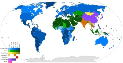 Existem cerca de 10 mil religiões diferentes em todo o mundo,[8] embora quase todas tenham grupos de seguidores relativamente pequenos e regionais. Quatro religiões - cristianismo, islamismo, hinduísmo e budismo - representam mais de 77% da população mundial. Cerca de 92% da população global segue uma das quatro religiões principais citadas ou se identifica como não religiosa,[9] o que significa que as mais de 9 mil religiões restantes representam apenas 8% da população do planeta. O grupo demográfico sem filiação religiosa inclui aqueles que não se identificam com nenhuma religião específica, como ateus e agnósticos, embora muitos ainda tenham várias crenças religiosas.[10]