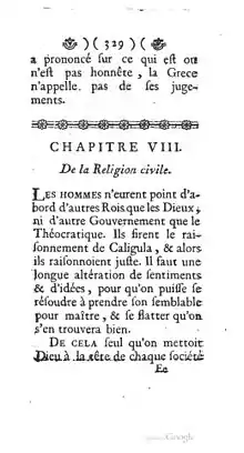 Como afirma Rousseau, "importa ao Estado que cada cidadão tenha uma religião que o faça amar seus deveres; os dogmas dessa religião, porém, não interessam nem ao Estado nem a seus membros, a não ser enquanto se ligam à moral e aos deveres que aquele que a professa é obrigado a obedecer em relação a outrem".[3]
