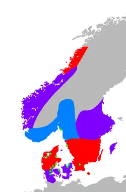 Mapa mostrando as diferenças regionais de culto (c. 900), determinadas através de dados arqueológicos e toponímicos. Em azul, as áreas onde os deuses do clã dos Vanir era primordialmente cultuado; o vermelho indica o culto de Thor, Odin e outros do clã dos Aesir, enquanto o roxo mostra as áreas onde ambos os cultos co-existiram