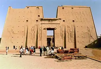 À entrada de um templo, encontravam-se obeliscos e estátuas monumentais, que antecediam o pilone. Nos templos do Império Novo, é comum a existência de uma avenida de acesso ladeada por esfinges com corpo de leão e cabeça de carneiro (que se acreditava protegerem o templo e o deus), na qual desfilava a procissão em dias de festa.