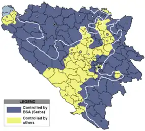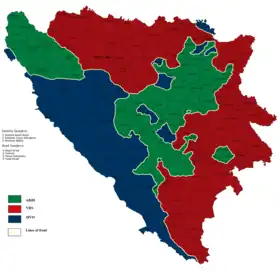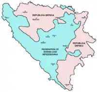 ![]() Território controlado pela Republika Srpska em 1995, mostrado em azul escuro, e o território controlado pelos bósnios-croatas e pelo governo da Bósnia mostrado em azul claro e amarelo, as demarcações subnacionais atuais delineadas em branco. | |||||||||||||||||