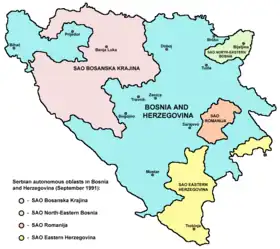 Em 9 de janeiro de 1992, a Assembleia dos Sérvios Bósnios aprovou uma declaração sobre a Proclamação da República do Povo Sérvio da Bósnia e Herzegovina (em sérvio: Republika srpskog naroda Bosne i Hercegovine / Република српског народа Босне и Херцеговине). Em 28 de fevereiro de 1992, a constituição da República Sérvia da Bósnia e Herzegovina (sérvio: Republika Srpska Bosna i Herzegovina / Српска Република Босна и Херцеговина) foi adotada e declarou que território do Estado incluía regiões autônomas e municípios sérvios, e outros entidades sérvias na Bósnia e Herzegovina (incluindo regiões descritas como "lugares em que o povo sérvio manteve-se em minoria, devido ao genocídio realizado contra eles durante a Segunda Guerra Mundial"), e foi declarado parte do Estado Iugoslavo Federal.