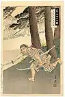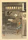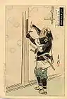 Shiota Matanojyo Takanori | Matanojyo teria sido um partidário da família Yoshida sob o nome de Ushioda Mondo. Depois que sua família se mudou para Ako, mudou seu nome para Takanori e se tornou um talentoso usuário de armas, principalmente a lança. Na noite do ataque, pela porta de traz ele lançou uma corda co um gancho, e voou como um passaro pelo muro. Não era preguiçoso e uma vez aberto o portão, lutou de maneira surpreendente. Ele foi até o jardim da mansão, mas foi visto e travou uma batalha contra Shimizu, um oponente a altura, ao final Takanori cortou-lhe a garganta. Ele e Miura Jirozaemon que estavam no local, não perderam tempo olhando para o cadáver de seu inimigo e logo partiram para o centro da mansão.[10] | ||||||||||