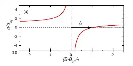 Na Figura 2 é apresentada o gráfico da expressão acima. O comprimento de espalhamento de fundo , que está associado a curva de potencial de fundo , representa seu valor distante da zona de ressonância. O valor para o qual o comprimento de espalhamento diverge, , representa o valor do campo magnético na ressonância, e o parâmetro é conhecido como largura de ressonância.