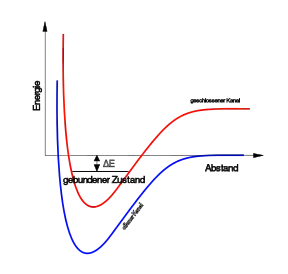 Para grandes distâncias internucleares R, a curva do potencial de espalhamento Vbg conecta assintoticamente o estado dos dois átomos livres,no regime de átomos frios. Em um processo de colisão, com uma pequena energia cinética E, este potencial representa um potencial aberto. O outro potencial Vc, representa um canal fechado, e descreve os níveis de energia dos estados moleculares. O efeito da ressonância de Feshback irá ocorrer quando a energia do estado ligado no canal fechado se aproximar da energia de espalhamento dos átomos não interagentes no canal aberto E. Aplicando um campo magnético externo, podemos controlar essa diferença na energia. Para isso basta que os momentos magnéticos nos dois canais sejam diferentes. Assim, para a colisão de ondas s, podemos escrever a amplitude de espalhamento a em função do campo magnético aplicado B da seguinte forma[4]