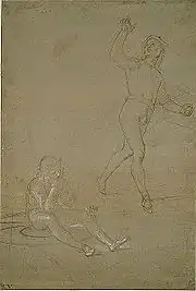 Para a obra em pauta, Rafael parece ter executado ao menos três desenhos preliminares, com esboços dos soldados e da figura do Cristo. Destes, dois encontram-se conservados no Ashmolean Museum de Oxford. Foram atribuídos a Rafael por Robinson em 1870[17] e aceitos de forma praticamente consensual pela literatura posterior.[2] Datados alternadamente entre 1499 e 1503, esses desenhos eram inicialmente considerados como estudos preparatórios para a supracitada Ressurreição de Cristo de Perugino, para a qual Rafael teria colaborado extensamente, segundo o senso comum.[11]