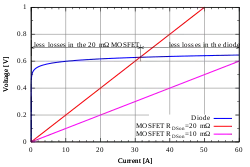 Queda de tensão através de um diodo e um MOSFET. A propriedade de baixa on-resistence de um MOSFET reduz perdas ôhmicas comparado com o diodo retificador (abaixo de 32 A neste caso), que apresenta uma significativa queda de tensão mesmo em baixos níveis de corrente. Paralelizando dois MOSFETs (curva rosa) reduz ainda mais as perdas, enquanto que paralelizando vários diodos não reduzirá significativamente a forward-voltage drop