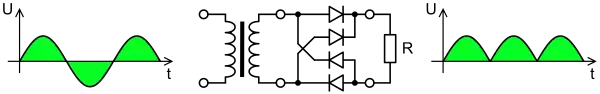 Um retificador de onda completa ou um retificador em ponte é equivalente a dois retificadores de meia onda voltados um de costas pro outro, com um retificador controlando o primeiro semiciclo e o outro o semiciclo alternado. Por causa do enrolamento do secundário com derivação central, cada circuito do diodo recebe apenas metade da tensão do secundário.[1] O circuito melhora o nível de CC a partir de uma entrada senoidal em 100%. O circuito empregado para realizar tal função é o que utiliza quatro diodos e uma ponte.[2]