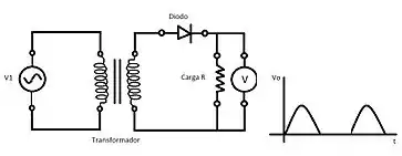 O circuito retificador de meia onda é composto por um único diodo acoplado na saída de um transformador. Graças a essa configuração, após a passagem pelo diodo, observam-se somente semiciclos positivos, pois durante o semiciclo negativo a tensão na carga é nula.[5]