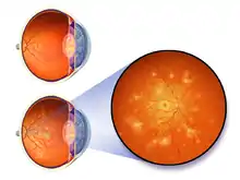 Retinopatia diabética é a lesão à retina, uma das complicações do diabetes mellitus, associada ao mau controle da glicemia. É uma causa frequente de perda de visão progressiva, podendo causar cegueira permanente nos estágios avançados.