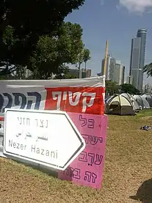 Antigos moradores de Netzer Hazani acampam num parque público de Tel Aviv, em protesto contra a remoção do assentamento da Faixa de Gaza.
