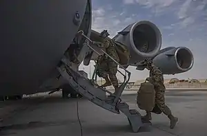 ![]() Pilotos americanos embarcando no C–17 Globemaster III, na Base Aérea de Al Udeid, em abril de 2021. | |||