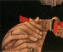 As mãos da mulher estão cruzadas de forma firme, como se estivesse em oração, e posicionadas de tal forma na base da pintura que aparentam estar em cima da moldura.[11] As mãos estão situadas numa pequena área da pintura, e é provável que Van der Weyden não quisesse que elas tivessem uma tonalidade muito forte para não distrair a atenção sobre a área da cabeça e ombros.[12] Os seus finos dedos foram minuciosamente detalhados; era habitual Van der Weyden indicar a posição social dos seus modelos pela maior atenção e detalhe dados à face e às mãos. A manga do seu vestido estende-se para além dos seus pulsos. Os seus dedos estão juntos e formam camadas; a sua representação é o elemento mais detalhado da pintura,[10] e dá início à forma piramidal da área superior da pintura.[12]