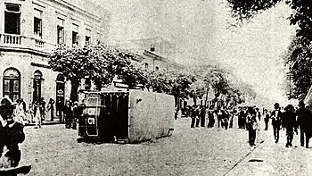 ![]() Bonde virado pela população na Praça da República durante a revolta. | |||||||||