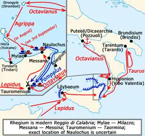 Em agosto, Agripa conseguiu finalmente derrotar Sexto em uma batalha naval em Milas (moderna Milazzo); no mesmo mês, Otaviano foi derrotado e gravemente ferido numa batalha perto de Taormina.